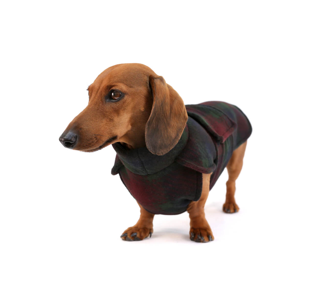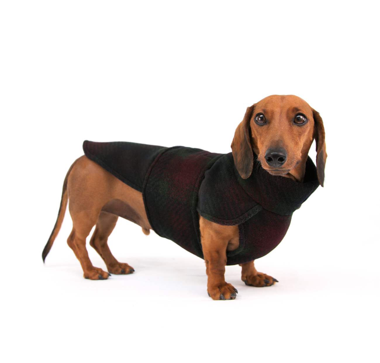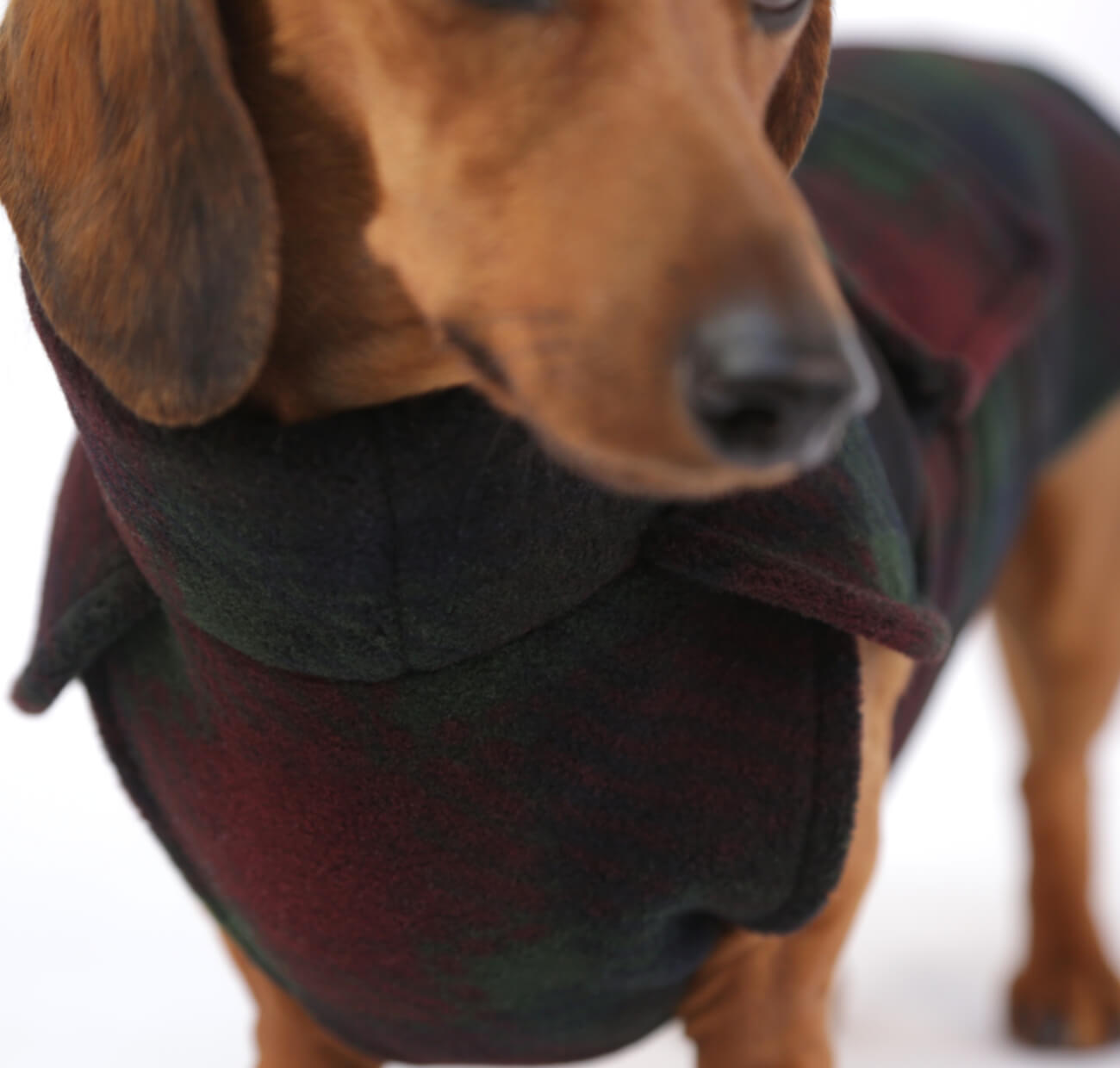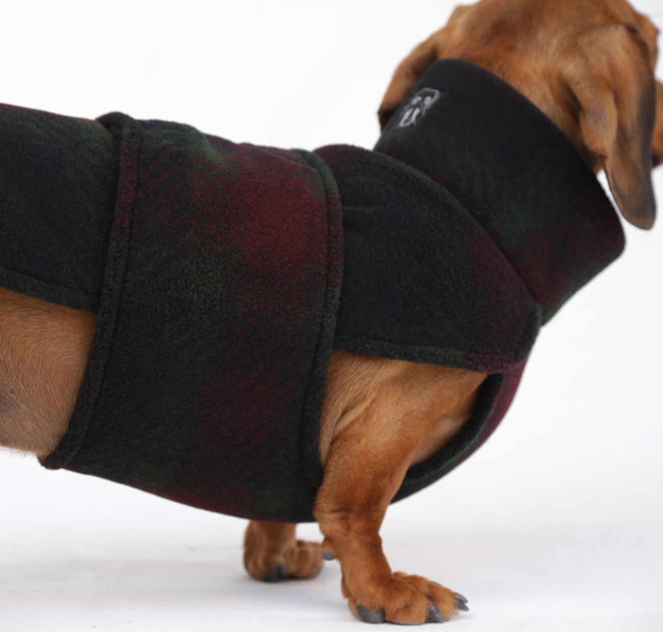 Our Dark Plaid Fleece Wrap in green, red and dark navy, is not just warm, but tailor-made for the long dachshund body. It features a high collar to protect the neck and keep cold air out, a covered chest and adjustable velcro straps around the belly. Embrace the warmth, embrace the style, whether it’s for a chilly evening stroll or a puppuccino date.